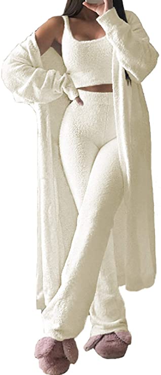 طقم سويت سوت نسائي من 3 قطع من الصوف مفتوحة من الأمام سترة قصيرة بدون أكمام وأرجل واسعة